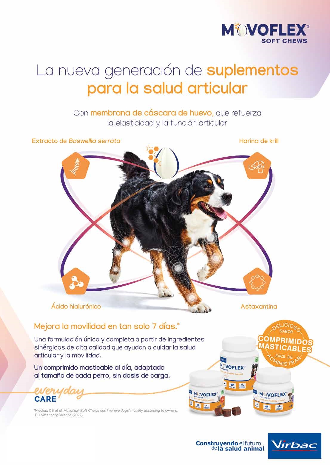 Este innovador suplemento para las articulaciones contiene membrana de cáscara de huevo BIOVAFLEX® para mejorar la movilidad y el rango de movimiento, ácido hialurónico para mantener las articulaciones flexibles y Boswellia serrata por sus propiedades antiinflamatorias. Disponibles para perros pequeños, medianos y grandes, tienen un sabor y una textura que les encanta a los perros, por lo que son fáciles de darle a su mascota todos los días. MOVOFLEX Soft Chews se ha investigado en perros, tiene un buen perfil de seguridad y proporciona un apoyo articular positivo.