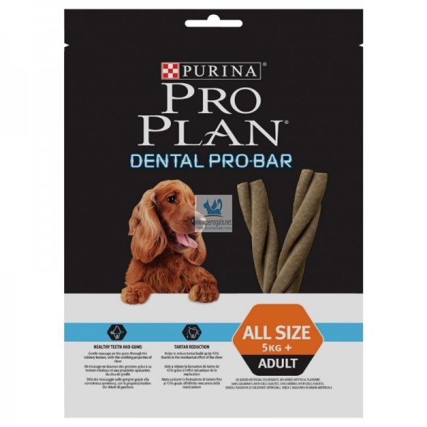 Purina Pro Plan Dental Pro Bar contiene extracto de clavo, con propiedades antiinflamatorias y analgésicas.